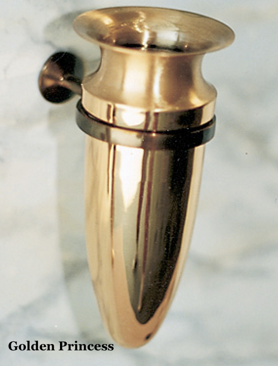 Our golden line mausoleum vases are built to provide cemeteries, funeral homes, and vault dealers with long-lasting, dignified flower holders. Made from solid jewler’s bronze, seal-coated and baked perma finish. These vases resist corrosion, preserve their finish, and deliver dependable performance in mausoleum settings. Choose from two timeless designs: the Empire Vase, featuring a strong and traditional profile, or the Princess Vase, with a graceful and refined style. Each is available in a range of sizes and offered in gold orย dark oxidized finishes. Choose between the button holder or ring holder. With durable construction, versatile options, and competitive pricing, our vases reduce replacement costs while ensuring family satisfaction. Order today to add strength, beauty, and reliability to your mausoleum offerings.
